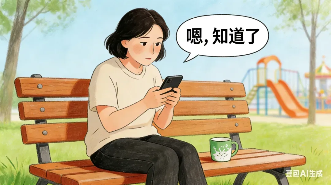 妈妈坐在一旁的长椅上,手里拿着手机,目光更多停留在屏幕上,只是偶尔抬头回应几句:“嗯,看到了。”