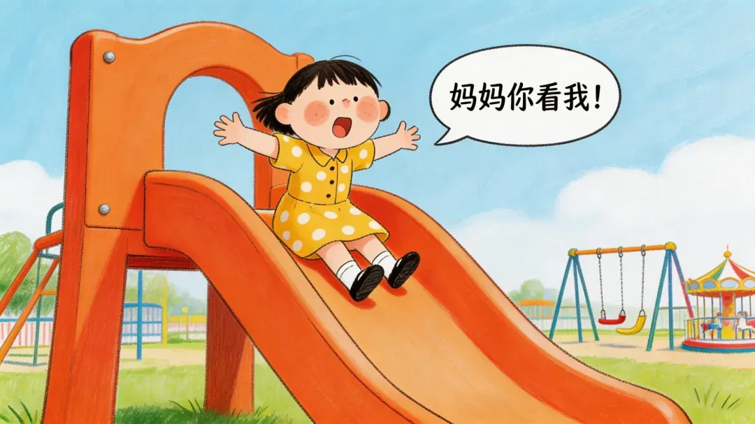 看到一个孩子兴奋地在滑梯上来回冲刺,跑得满脸通红,一边玩一边对着妈妈喊了好几次:“妈妈你看我!”